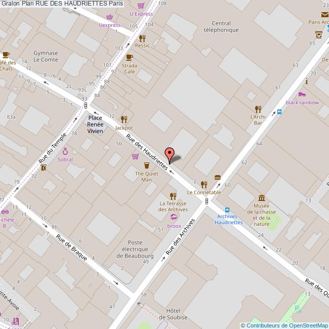 Location. 5 Rue des Haudriettes, Le Marais, Paris, 75003 Paris. Despite its name, you won’t find a single modern bottle of booze on the shelves at this relatively new Paris bar. The only bottles on display at Bar Nouveau are… Elle est citée sous le nom de « rue des Haudriettes », pour une partie, et « rue de l’Eschelle du Temple », pour l’autre partie, dans un manuscrit de 1636 dont le procès-verbal de visite, en date du 22 avril 1636, indique : « pleine de boues et d’immundices » . En 1662, les Haudriettes quittèrent leur chapelle située dans cette rue 2 .