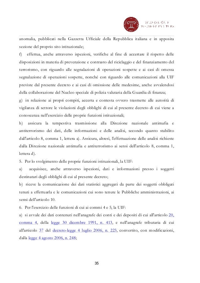 DECRETO LEGISLATIVO 21 novembre 2007, n. 231. Attuazione della direttiva 2005/60/CE concernente la prevenzione dell’utilizzo del sistema finanziario a scopo di riciclaggio dei proventi di attività criminose e di finanziamento del terrorismo nonchè della direttiva 2006/70/CE che ne reca misure di esecuzione. note: Entrata in vigore del.. DECRETO LEGISLATIVO 21 novembre 2007, n. 231. Attuazione della direttiva 2005/60/CE concernente la prevenzione dell’utilizzo del sistema finanziario a scopo di riciclaggio dei proventi di attività criminose e di finanziamento del terrorismo nonchè della direttiva 2006/70/CE che ne reca misure di esecuzione. note: Entrata in vigore del.